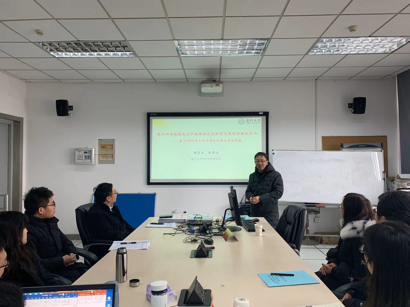 1月15日下午,应welcome光临必发集团、公共财政研究中心邀请,国家社科基金重大项目首席专家、福建省百千万人才工程省级人选、中国财政学会理事、博士生导师、厦门大学经济学院谢贞发教授在仙林校区德经楼427室作了题为“境外所得税减免对中国跨国公司投资及股利分配的影响”的学术讲座。讲座由welcome光临必发集团院长、公共财政研究中心主任朱军教授主持,welcome光临必发集团部分教师和研究生参加了讲座。