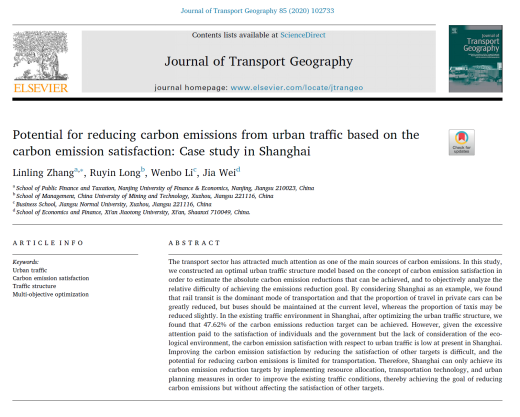 近日,我院税收学系张琳玲博士以第一作者在SSCI检索国际期刊《Journal of Transport Geography》2020年第85卷发表1篇论文,题为《Potential for reducing carbon emissions from urban traffic based on the carbon emission satisfaction: Case study in Shanghai》,该期刊是在JCR分区中处于经济学领域一区(SSCI, Q1)。本论文构建了碳减排视角下城市交通结构优化模型,该模型不仅从绝对量上分析可以实现的碳减排量,还从相对量上客观分析城市交通碳减排目标实现的难易程度。研究结果显示,现阶段城市交通碳减排满意度极低,此时通过降低其他目标满意度来改善碳减排满意度的难度较大,交通碳减排潜力有限。