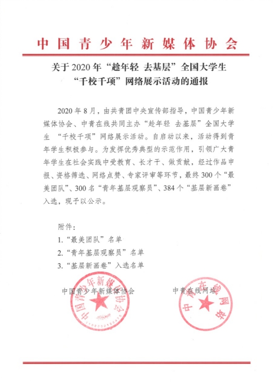 近日,由共青团中央宣传部指导,中国青少年新媒体协会、中青在线共同主办了“趁年轻 去基层”全国大学生“千校千项”遴选结果公布。我院“Radio”队入选“基层新画卷”。