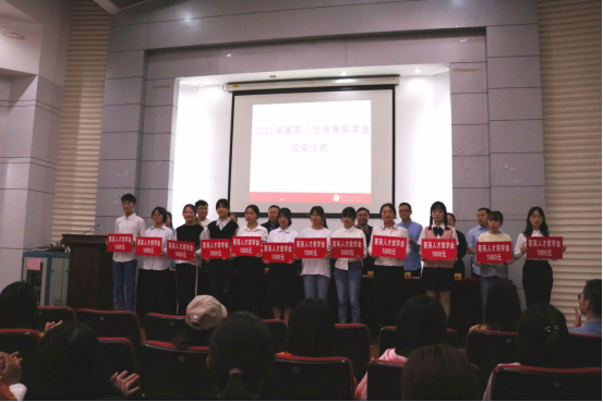 随后举行了2020年度 “财税学院精英人才培育奖学金”颁奖仪式。副院长田志刚宣读了2020年学院“精英人才培育奖学金”获奖名单。高晓颖、蒋大为等14名2019级同学获得奖学金,主席台嘉宾为获奖学生颁奖。