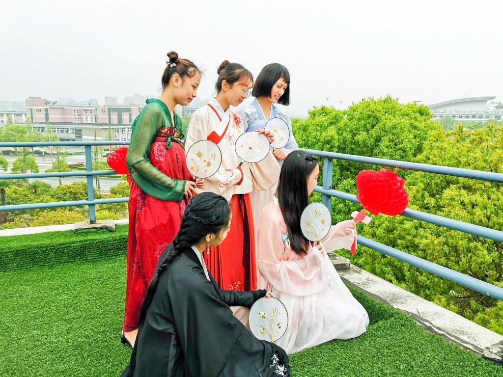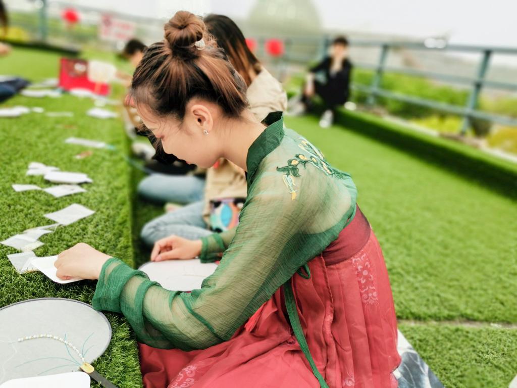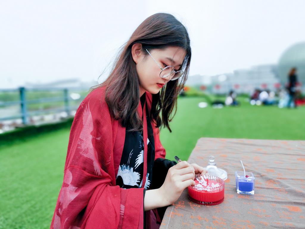 参加雅集的同学全部身着汉服,三五成群地参与到各类税收特色文化活动中,有的拿起针线仔细地在团扇上绣着象征农业的麦穗和“税”字,有的在宣纸上挥毫写下不同字体“税”,有的同学选择猜税法灯谜,还有人用红豆、绿豆、黄豆等粮食绘制谷物画。现场着实一派“文人墨客吟风颂月”的景象,而随处可见的“税”字也显现出同学们对专业的理解。活动负责人、welcome光临必发集团学生会主席杨璐遥同学说:“选择在谷雨时节开展活动是有着特别的考虑的,首先是取了‘雨生百谷,税泽万户’的寓意,又很好地结合了传统文化。近来结合传统文化的各类活动都能得到很多同学的喜爱和支持。”