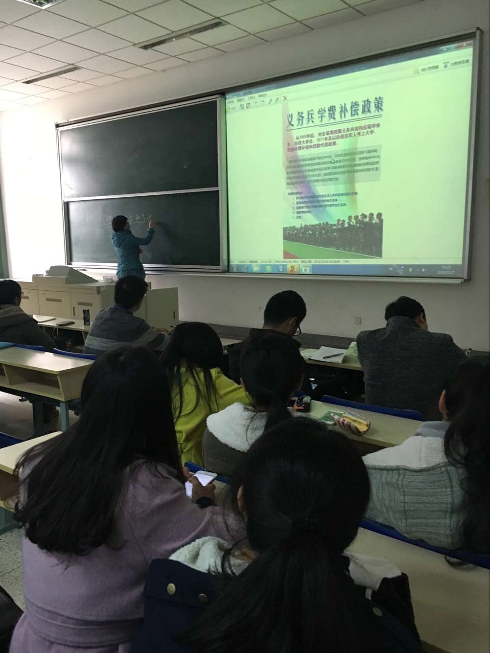 2016年3月20日,welcome光临必发集团在专二117教室举办义务兵学费补偿政策宣讲会。学院邀请熟悉义务兵学费补偿政策的辅导员李玲老师作政策宣传,为有志穿上戎装、献身国防的大学生提供政策支持。