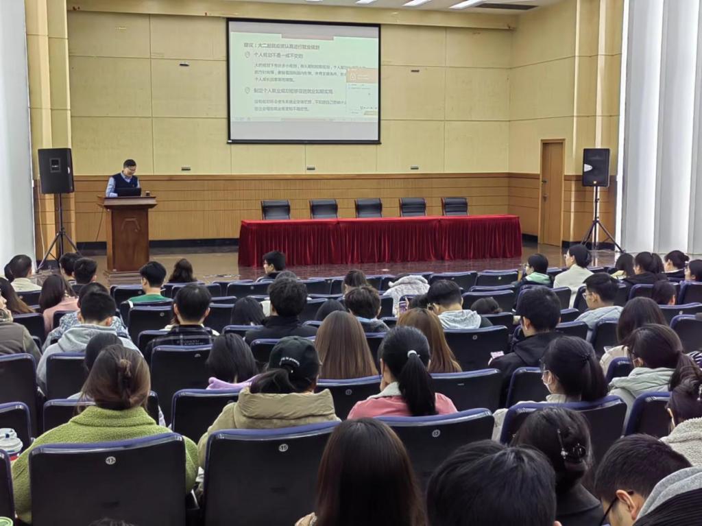 首先,江苏省自然资源厅杨建明处长为大四学生带来名为《大学生就业与面试技巧》专题讲座,他围绕就业规划、就业准备与技巧、就业岗位、就业城市和面试技巧等部分展开讲述,助力学院就业专项行动。杨建明分析了今年国考考试情况和就业形势。他指出,国考参与率再创历史新高,但是近几年是退休高峰,会有大量岗位空出,并指出除国考外还有省考、事业编等其他就业渠道,鼓励大家善用自己的同学资源,勇于参加考试。随后,杨老师对考试具体要求作出指导:第一、要加强知识学习,提高自身综合素质,多关注时事政治;第二、要通过多种渠道了解招聘信息,认真对待企业和工作地点的选择;第三、要关注考试流程和用人单位的信息,注重身体锻炼,提升政治素养;第四、就业前考虑自身家庭背景,多与父母沟通交流;第五、分析面试的内容和形式,学习掌握面试技巧,调整好心态。