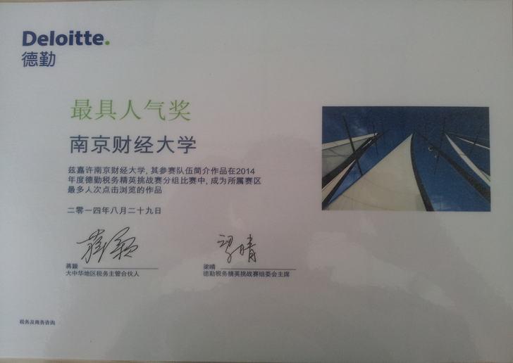 全国比赛于2014年10月25-26日在上海举行,通过个案分析、PPT展示、评委提问等环节,经德勤高级合伙人与外聘专家组成的评审团评审,北京大学、上海财经大学和中山大学的代表队分获冠、亚、季军。我校代表队获得优异奖。