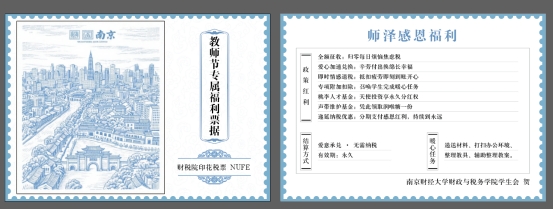老师们手上拿着的便是南财财税学院学生们精心设计的“财税教师节专属福利票据”,其设计独具匠心,正面是精致的南京城市线描图,底部为“财税院印花税票NUFE”的标识,票据背面的“师泽感恩福利”,满是为老师量身定制的暖心“政策”,例如:“全额征收:归零每日烦恼焦虑税”,愿老师们抛却烦忧;“爱心加速兑换:辛劳付出换绵长幸福”,感恩老师的辛勤耕耘;“即时情感退税:抵扣疲劳即刻到账开心”,希望老师时刻拥有好心情。这份福利票据的结算方式更是暖心,“爱意承兑•无需纳税”,且“有效期:永久”,意味着这份师生情,永远鲜活。收到这份礼物的李老师十分激动,表示“财税教师节专属福利票据”既融合了财税特色,也很好地给老师们关怀。
