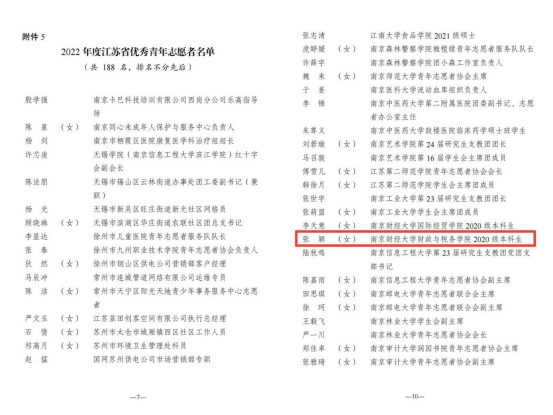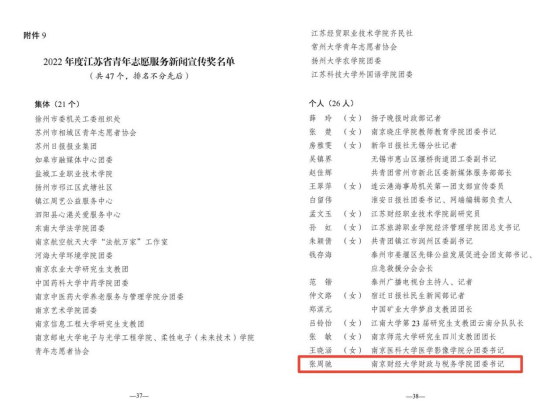 日前,共青团江苏省委、江苏省青年志愿者协会开展了2022年度全省青年志愿者行动先进典型评选工作。我院在此次评选中获多项荣誉,其中,我院张周驰老师获“2022年度江苏省青年志愿服务新闻宣传奖”,税收2002班张颖获“2022年度江苏省优秀青年志愿者”称号。这也是我院继“税月初心”税法普法青年行动项目荣获“2021年度江苏省优秀青年志愿服务项目”、“‘接力爱 接力奋斗’——welcome光临必发集团志愿服务项目”荣获“2018年度江苏省优秀青年志愿服务项目”后,志愿服务工作再获省级表彰。