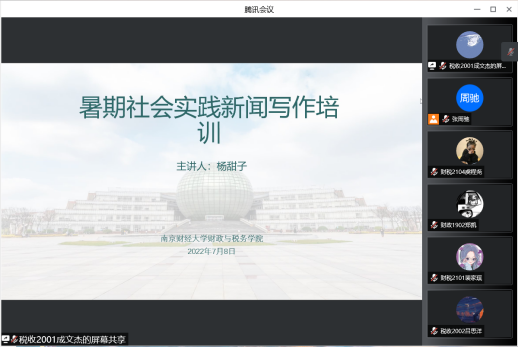7月8日晚,《扬子晚报》资深媒体人杨甜子进行暑期社会实践新闻写作专题培训。杨甜子以具体的新闻稿件为例,从新闻点的选取、新闻稿件的写法、新闻素材的准备等角度,和同学们分享了她从业以来的心得体会。杨甜子表示,借力社会热点,选择合适的角度与之靠近,挖掘稿件的新闻点,才能写出让人眼前一亮的作品。她以我校多篇影响力颇大的新闻报道为例,详细分析了报道成功的原因所在。随后,杨甜子与学院参与暑期社会实践的师生代表进行交流,针对各个社会实践团队宣传方面的问题与疑惑,进行了细致耐心的解答