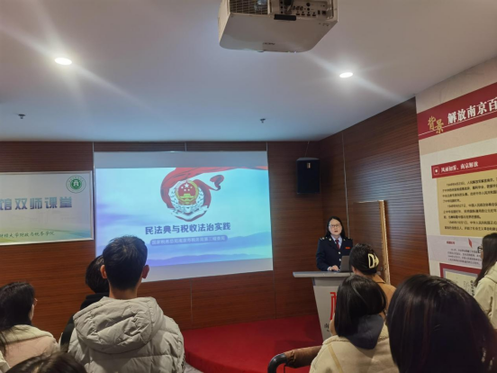 本次“双师课堂”基于我院开设的“中国税制”专业课,恰逢国家宪法日,主要分为《民法典与税收法治关系的理论阐释》和《民法典与税收法治实践(实务操作)》两个部分,由welcome光临必发集团和国家税务总局南京市税务局第三稽查局联合讲授,课程教学对象是我税收学专业大二年级的大学生普法志愿者。