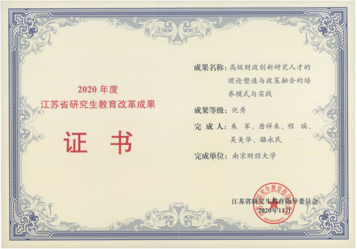 2020年11月9日,江苏省研究生教育指导委员会下发《关于公布2020年江苏省研究生教育改革成果评选结果的通知》(苏研教指[2020]1号),经专家材料评审、复评答辩评审等多重环节,我院一项研究生教学成果“高级财政创新研究人才的理论塑造与政策融合的培养模式与实践”(完成人:朱军、唐祥来、程瑶、吴美华、骆永民)获江苏省研究生教育改革成果优秀奖。