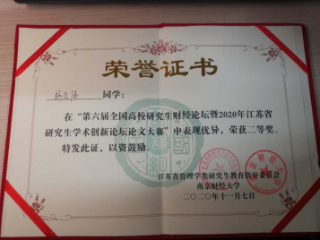 11月7日,我院2019级专业学位硕士研究生杨志伟(导师:朱军教授)撰写的论文——《长三角一体化视角下的财政分权与教育均等化研究》,在第六届全国高校研究生财经论坛暨2020年江苏省研究生学术创新论坛论文大赛中荣获二等奖。