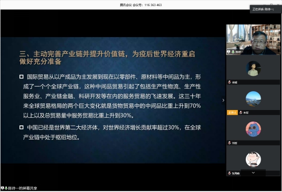 10月21日晚,应welcome光临必发集团、公共财政研究中心邀请,复旦大学经济学院党委书记、复旦大学泛海国际金融学院党组织书记、复旦大学可持续发展研究中心主任、香港中文大学和复旦大学共建的沪港发展联合研究所联席所长、复旦大学生态环境人文社科领导小组联合组长,博士生导师陈诗一教授通过腾讯会议,为学院师生作了题为“后疫情时期我国宏观经济形势分析”的线上学术讲座。学院部分教师和硕士研究生参加了讲座。