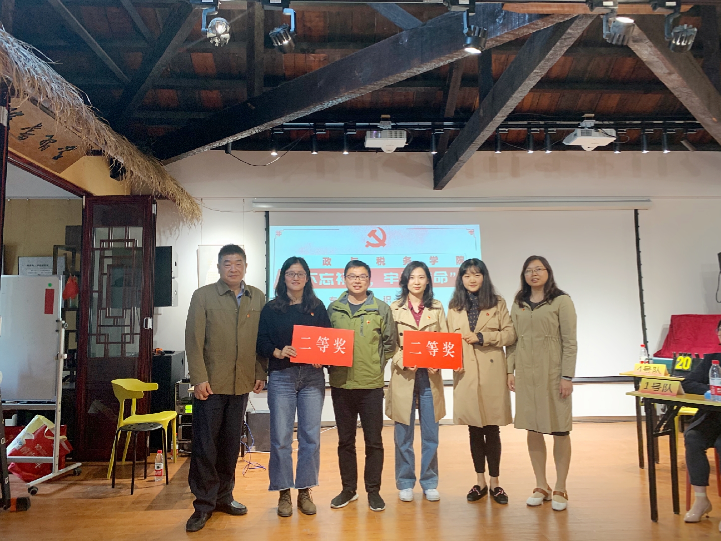 竞赛现场,由各个支部选派的12名选手组成6支代表队展开激烈较量。各队选手配合默契、沉着应答。经过必答题“一展风采”、抢答题“你追我赶”和风险题“扭转乾坤”等环节的较量比拼,最终,财政系支部李慕原、李亚婧两位老师组成的1号代表队获得本次知识竞赛一等奖,税务系支部管永昊、汪卢俊两位老师组成的5号、夏慧琳、庞雨蒙两位老师的6号代表队获得二等奖,张洪慧、张文杰两位老师的2号、毛翠英、张海峰两位老师的3号队、张琳玲、刘家成两位老师的4号代表队获得三等奖。