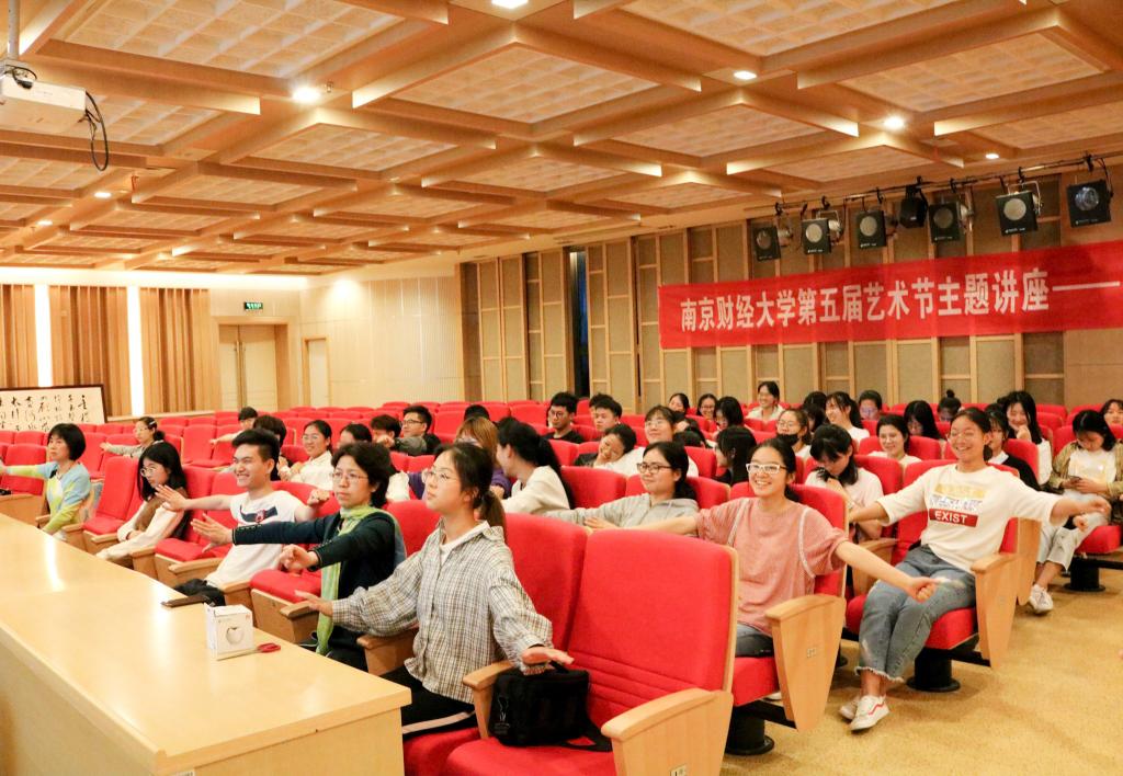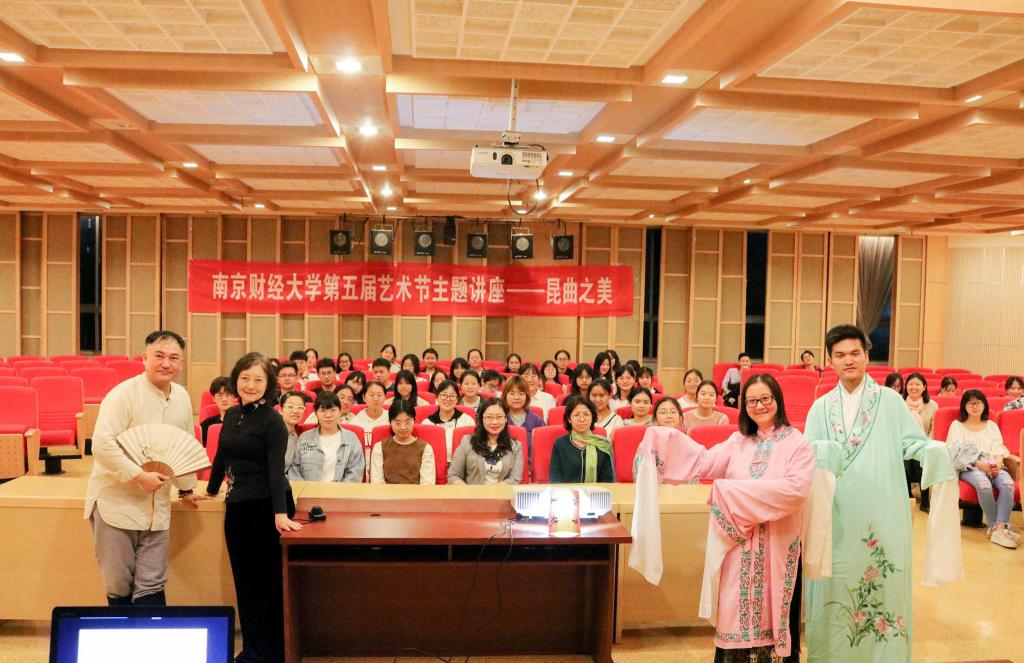 讲座由财税学院党委副书记李慕原主持,主讲人王斌是江苏省演艺集团歌剧舞剧院艺术指导,原任昆剧院副院长,导演,国家一级演员,国家文华导演奖得主。他在讲座的一开始,便将昆曲的欣赏心,归结为“拿得起,放得下,想得开”三大要素,强调应通过这种欣赏心升华审美,敏锐感知。随后,他就“不到林园,怎知春色如许”这句词示范表演,赢得现场观众的掌声与喝彩。为了使在座师生理解昆曲程式,王斌以动漫视频“粉墨宝贝”形式为大家介绍了生、旦、净、末、丑,并亲自示范四功五法。并邀请助演嘉宾施立群老师合作演唱牡丹亭,歌声余音绕梁将现场气氛推向高潮。王老师表示:“舞台源于生活。在扮演各色角色后,我才明白,生活中不必纠结于开心与难过,加强自身对抗负情绪的能力来营造美好的生活环境才尤为重要”。