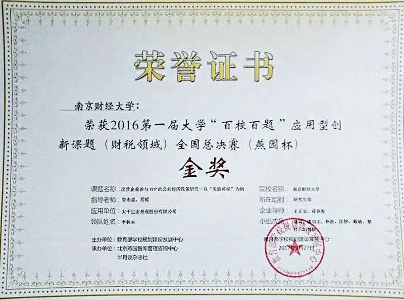 9月27日,由教育部学校规划建设发展中心主办的首届全国大学“百校百题”应用型创新课题(财税领域)大赛全国总决赛在北京落下帷幕。经过激烈角逐和专家评议,我院指导的我校参赛课题《民营企业参与PPP的公共经济政策研究——以“美丽蒋坝”为例》脱颖而出,摘得研究生组金奖桂冠(名单附后)。