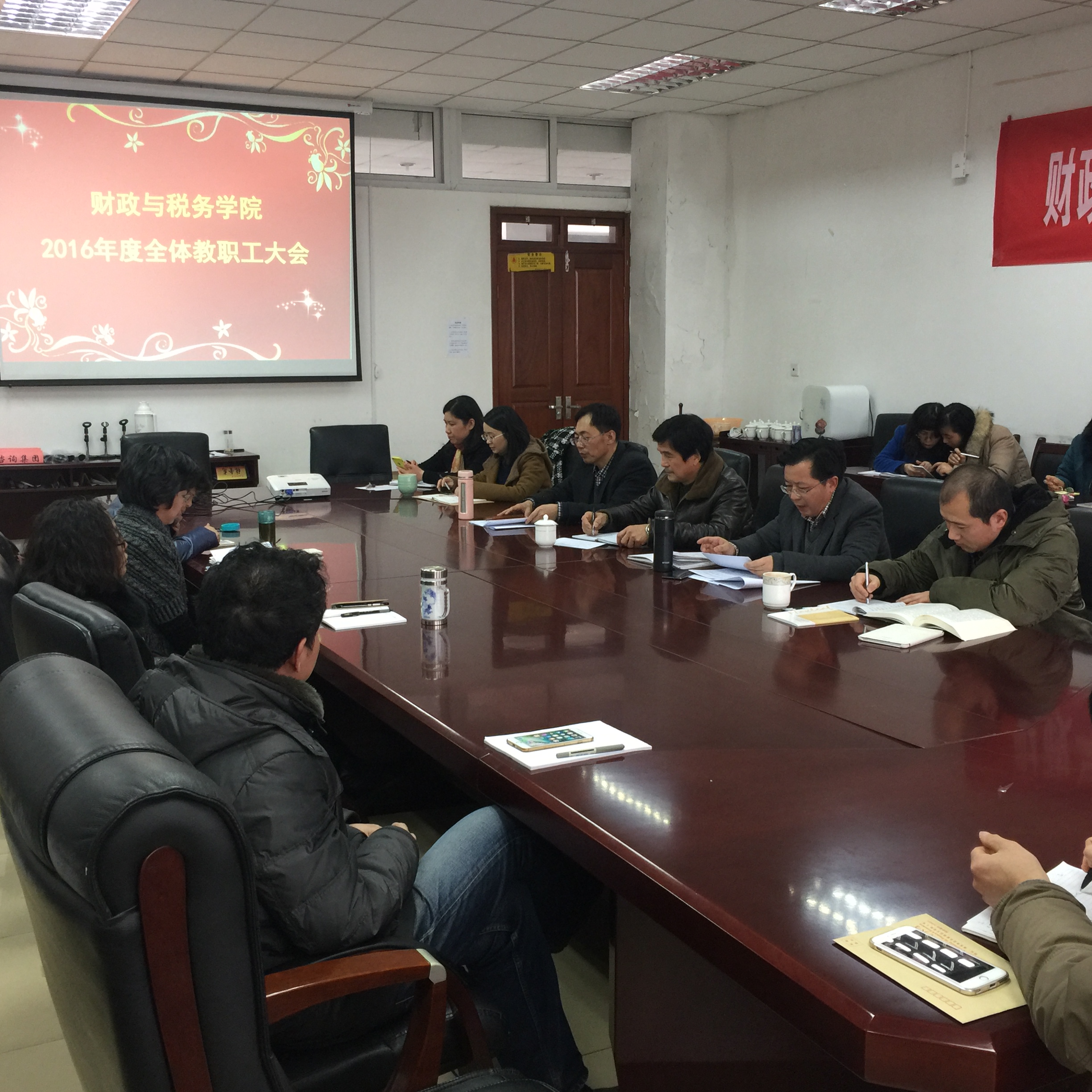 1月4日下午,我院在408会议室召开2016年度教职工大会,学院党政领导、教职工参加会议。校工会副主席张耀光应邀参加会议。会议由党委书记张金龙主持,院长李林木作大会报告。