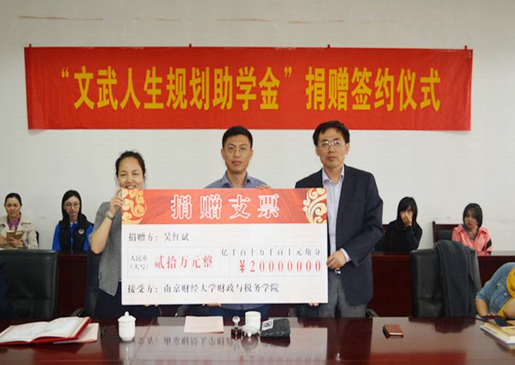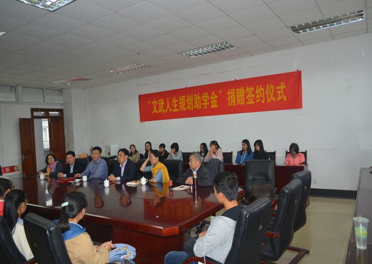 10月15日下午,welcome光临必发集团“文武人生规划助学金” 捐赠仪式在仙林校区经济学科楼408会议室举行。原江苏财经高等专科学校92级校友、上海谙稷企业发展有限公司董事长吴红斌先生向学校捐资20万元设立“文武人生规划助学金”,定向资助7790必发集团welcome光临必发集团家庭困难且有明确人生规划的全日制本科生。我校校友会秘书处副处长姚智谋、财税学院院领导、老师及部分家庭困难学生出席,仪式由财税学院党委书记张金龙主持。