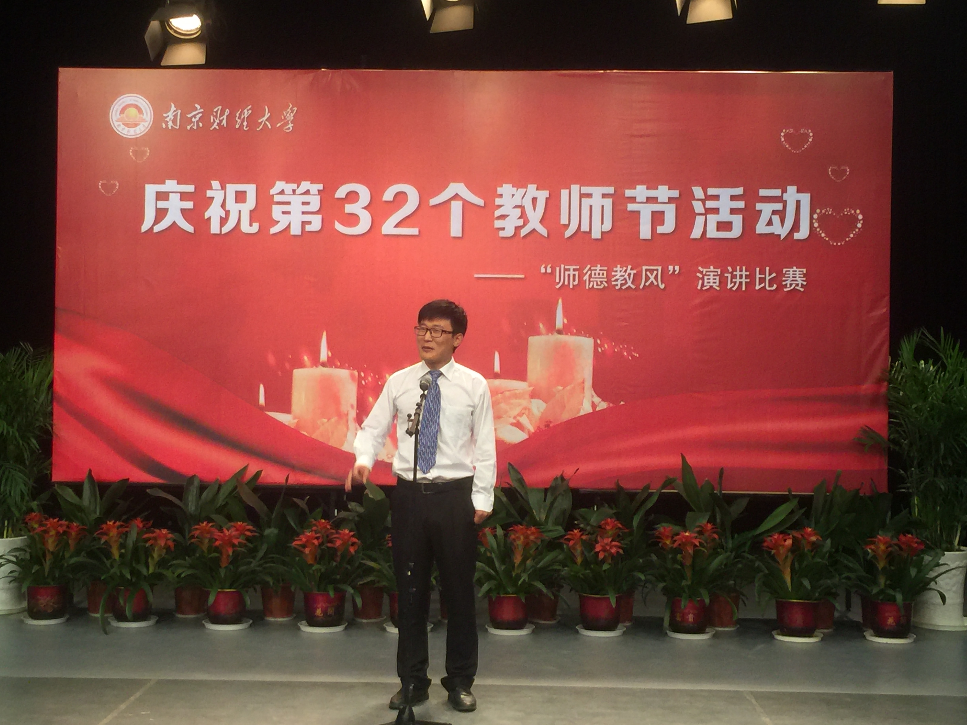 9月8日下午,在第32个教师节到来之际,我校“师德教风”演讲比赛在仙林校区校园电视台演播厅举行,来自18个学院(部)的一线青年教师参加了比赛。我院新入职教师徐超博士发挥出色,表现优异,荣获本次比赛一等奖。副校长鞠兴荣、俞安平出席活动,并为获奖教师颁奖。