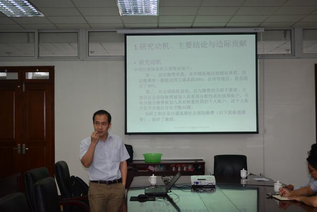 此次讲座主要围绕着毛捷教授近期发表的一篇独具创新且意义深远的论文《社会保险缴费率、参保概率与缴费水平——对职工与企业逃避费行为的经验研究》展开。首先毛教授介绍了我国现在社会保险的特征,即法定交费率高,五险一金缴费率将近达到工资总额的40%,目前只有德国、波兰、匈牙利、芬兰四国缴费率比我国高;社保收益低且与缴费关联不紧密,大部分社保缴费被划入具有再分配性质的统筹账户,只有很少部分被划入具有积累作用的个人账户,而个人账户在不少地区存在空转问题;社保缴费和社保收益的发放均有地方政府管理,造成社保体系的地区分割,全国范围内只有陕西、北京、上海、天津四个地区实现了省级统筹,这样使人民的社保利益得不到有效维护。社会保险的以上特点极大程度上刺激了职工和企业的逃避费行为,职工和企业对此做出两种反应:一是是否参加社会保险:二是如果已经参加社会保险,他们会在很大程度上降低缴费水平,使得实际缴费率低于法定缴费率,如企业并未按中央规定以工资总额作为缴费基础,而是以其中的计时、计件等三项为基础来缴费。对上述两种反应毛教授还进行了实际调查,从统计数据上做了论证。