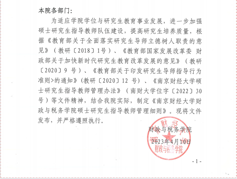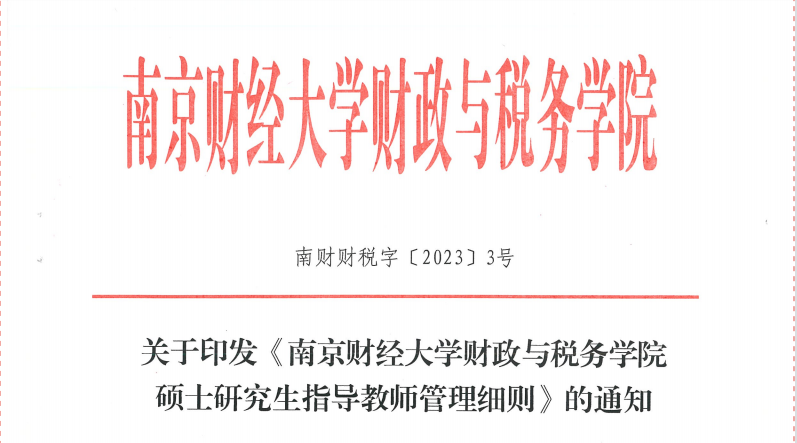 第一条 为适应学校学位与研究生教育事业发展,进一步加强硕士研究生指导教师(以下简称硕士生导师)队伍建设,提高研究生培养质量,根据《7790必发集团硕士研究生指导教师管理办法》(南财大学位字〔2022〕30 号),结合我院实际,制定《财政与税务学院硕士生导师管理细则》,并予以严格执行。